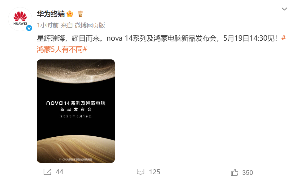 5月13日,华为终端微博称,nova 14系列及鸿蒙电脑新品发布会,5月19日14:30见。